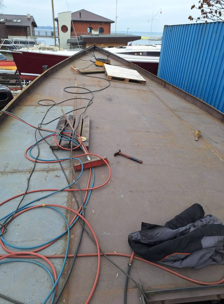For some reason the boat was not restored in Plymouth as originally planned. In autumn 2019 she was delivered to Complex Jacht with a plan of rebuilding her in Puck. However as the transport could reach the shipyard due to narrow streets the boat was unloaded in Jastarnia and towed to Puck via water after careful preparation (patching all the holes and putting a temporary GRP layers on the hull). The boat has been emptied and the hull was sand-blasted to evaluate its state and the necessary scope of replacing the plates. It turned out the around 80% of plating is in a poor state. The next works planned were to shed the yacht and start to replace the sheeting. However at the beginning of 2020, due to the owner health issues the project has stopped and the boat is currently threatened with being cut up for scrap. Her only salvation is finding a new owner willing to get her back to good shape and enjoy sailing on a boat with such history.